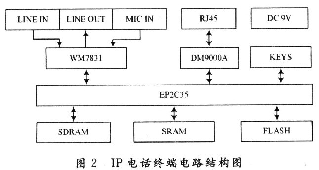 根據1P電話終端的硬件需求,為該終端配置了音頻接入口、音頻編解碼芯片WM8731;網絡接口芯片DM9000A;存儲器IC42S16400;主控制器EP2C35;直流電源9