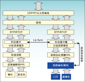 盡管同步并不是一個很大的運算負(fù)擔(dān),但同步算法和實現(xiàn),包括抖動緩沖管理,都需要特別小心方可達(dá)到預(yù)期的結(jié)果。有效的方法是,將該處理與總的系統(tǒng)控制和編解碼處理管理緊密地協(xié)調(diào)。一種最好的方案是將同步處理放在實現(xiàn)更高級功能的系統(tǒng)通用主CPU上來實現(xiàn)。