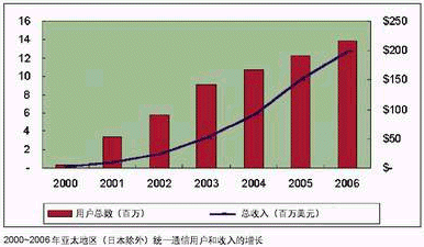 據(jù)IDC預(yù)測,亞太地區(qū)(不包括日本)統(tǒng)一通信用戶數(shù)量將從2000年的32萬增長到2006年的1385萬。盡管起點(diǎn)較低,收入將從2000年的119萬美元增長到2006年的1.987億美元。這個增長大部分受中國和澳大利亞推動,在這兩個國家,價格和市場由上層大電信公司決定。