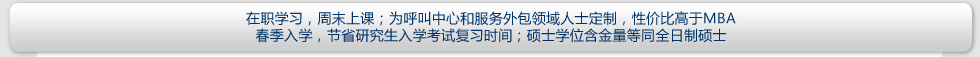 | 報(bào)名條件 | 擁護(hù)中國憲法,遵守法律、法規(guī),品行端正,身體健康,并能堅(jiān)持在職學(xué)習(xí); 大專及以上學(xué)歷,旨在提高本人專業(yè)素質(zhì)和學(xué)歷層次的 社會(huì)在職人士均可報(bào)名;擇優(yōu)錄取。 呼叫中心、服務(wù)外包領(lǐng)域的中高級(jí)從業(yè)者,英語基礎(chǔ)良好的人士將獲得優(yōu)先錄取機(jī)會(huì)。 |