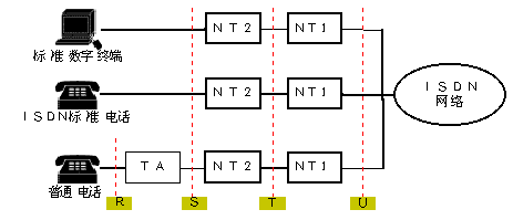 TA:終端適配器,完成非標(biāo)準設(shè)備到ISDN速率的匹配及協(xié)議轉(zhuǎn)換(它可以在TE2中內(nèi)嵌實現(xiàn));以上各類設(shè)備間的連接接口稱為參考點(見下圖):