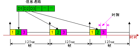 TDM就是時分復(fù)用模式。它把若干不同通道(Channel)的數(shù)據(jù)按照固定位置分配時隙(TimeSlot:8Bit數(shù)據(jù))合在一定速率的通路(Path)上。每一個時隙的速率為一個標(biāo)準(zhǔn)的PCM(Pulse-Code-Modulation)話路64Kbps。每通道時隙的重復(fù)頻率為Ts=8KHz,即幀周期為125us。如圖2所示。通常把若干通話復(fù)用在一起以后的通路組稱為一個基本群路,然后更大的通路均在此基礎(chǔ)上進(jìn)一步復(fù)用(4倍)為高次群。其中的時隙數(shù)即復(fù)用的通道數(shù)與時鐘有關(guān)。國際上有兩個不同的基群標(biāo)準(zhǔn)(PRI:Primary Rate Interface)。美國和日本采用24支路標(biāo)準(zhǔn),我國采用歐洲標(biāo)準(zhǔn),使用32路標(biāo)準(zhǔn),分別記為:
