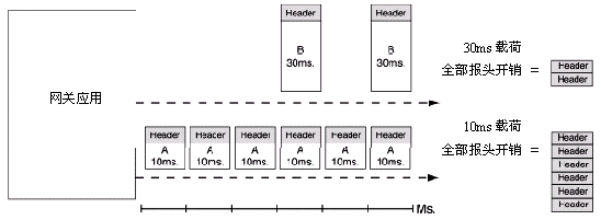 在一個(gè)減少發(fā)話方和受話方間音頻反應(yīng)時(shí)間的努力中,VoIP網(wǎng)關(guān)通常會(huì)配置成發(fā)送較小的語音數(shù)據(jù)載荷。雖然這樣做通常可以減少聽得見的傳輸延遲,但同時(shí)也增加了一個(gè)給定語音數(shù)據(jù)流需要傳遞的包的數(shù)量。因?yàn)椴还芏嘈〉囊纛l載荷都需要一個(gè)固定大小的包報(bào)頭,網(wǎng)上需要傳遞的數(shù)據(jù)量越大這個(gè)效果越明顯──跟隨的是網(wǎng)絡(luò)包和數(shù)據(jù)流量的相應(yīng)增長。圖1說明了用于傳輸包報(bào)頭的帶寬會(huì)隨著包載荷大小的縮小而增大。