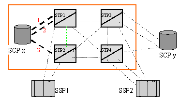 圖中紅色框內(nèi)的網(wǎng)絡(luò)包括SCPx,STP1和STP2三個信令點。鏈路1和2構(gòu)成SCPx和STP1之間的鏈路集。鏈路3構(gòu)成SCPx和STP2之間的鏈路集。