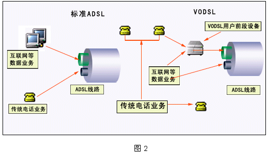VoDSL技術(shù),就是利用xDSL技術(shù)在一對傳統(tǒng)電話用戶線上,維持原有電話業(yè)務(wù)的同時,提供高速數(shù)據(jù)業(yè)務(wù)(如互聯(lián)網(wǎng)業(yè)務(wù))和多個額外電話業(yè)務(wù)。利用VoDSL技術(shù),業(yè)務(wù)提供商在無需增添新的數(shù)據(jù)網(wǎng)絡(luò)或硬件線路就可以為用戶提供高速的數(shù)據(jù)接入和更多的電話線路數(shù)及其他增值業(yè)務(wù),從而減少運營成本,擴(kuò)大了利潤空間。下圖2的左邊給出了電話運營商采用ADSL技術(shù)的基本配置,右邊則給出了VoDSL應(yīng)用。