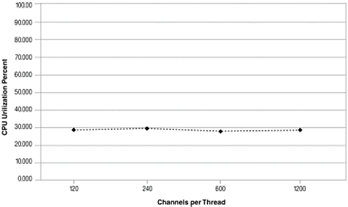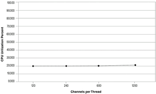 擴(kuò)展異步模式使用了36%到28%. 系統(tǒng)顯示了很高的擴(kuò)展性, CPU使用率和通道數(shù)成線形增長.