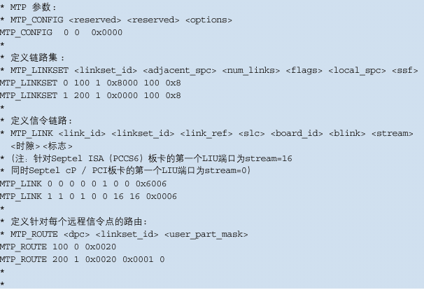 system.txt文件必須也包括主機(jī)上運(yùn)行的所有本地SS7協(xié)議,如ISUP、TUP、SCCP或TCAP(如果有),以及應(yīng)用程序任務(wù)、配置工具(如s7_mgt)和調(diào)試工具的LOCAL定義。這里也應(yīng)該通過FORK_PROCESS語句來啟動相應(yīng)的驅(qū)動和支持任務(wù),在相應(yīng)的程序員手冊中有詳細(xì)描述。