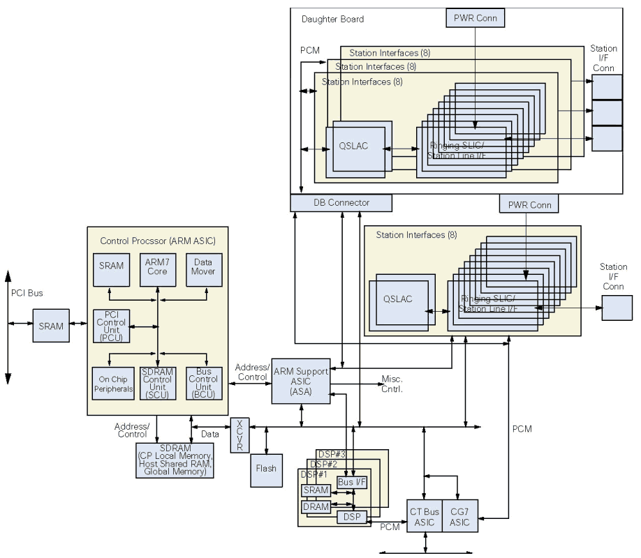 DSPs 直接有PCM連接到CTbus ASIC, 它提供SCbus/CTbus(H.100)和模擬座席接口之間PCM交換的功能.