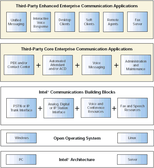 - 第3層:PSTN或IP中繼線接口的Dialogic通信構(gòu)建模塊;模擬、數(shù)字或IP站接口;以及語(yǔ)音、會(huì)議、傳真和話音(speech)資源。
