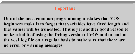 變量長(zhǎng)度有限制,如果字符串的長(zhǎng)度大于最大長(zhǎng)度,則按最大長(zhǎng)度取值。如果在調(diào)試模式下運(yùn)行VOS,當(dāng)一個(gè)字符串被截短后會(huì)彈出一個(gè)警告信息。(如果要避免這些告警,賦值時(shí)使用substr函數(shù))