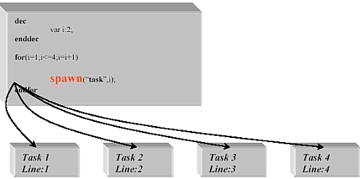 VOS內(nèi)部同時(shí)運(yùn)行4個(gè)任務(wù)。開始只有一個(gè)任務(wù),此任務(wù)產(chǎn)生了4個(gè)任務(wù),各任務(wù)間互相傳遞參數(shù)(通道號(hào))。函數(shù)arg(1)檢索參數(shù)個(gè)數(shù)1,這種情況下,arg()是通道號(hào)碼。