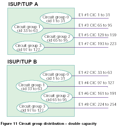 兩個(gè)系統(tǒng)中的電路組既可以從0開始編號(hào),也可以兩個(gè)系統(tǒng)間隔標(biāo)號(hào)。如果使用第一種方法,整個(gè)系統(tǒng)的容量就是單ISUP/TUP協(xié)議層系統(tǒng)的容量的2倍,如果使用第二種方法,系統(tǒng)總?cè)萘颗c單ISUP/TUP協(xié)議層系統(tǒng)的容量相同。對(duì)于這兩種情況,每半部分控制對(duì)立的CIC范圍,如圖11和12所示: