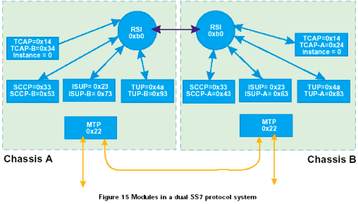 下圖中描述了一個(gè)雙ISUP/TUP/SCCP/TCAP系統(tǒng)中各模塊之間的關(guān)系,以及系統(tǒng)兩部分的config.txt文件中的條目。參見圖15。