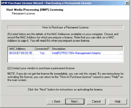 5. 聯(lián)系你的廠家購(gòu)買一個(gè)永久許可證。你必須提供從在4步中得到的MAC地址。可獲得的許可證列表參見表3""HMP