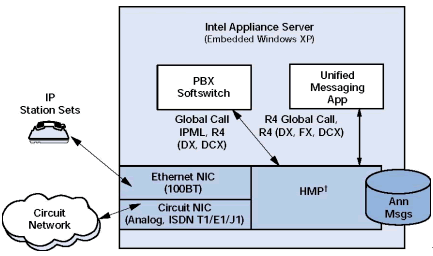 PBX 應(yīng)用可以被實(shí)施在一個(gè)低成本的Dialogic應(yīng)用設(shè)備或一個(gè)使用Dialogic處理器的普通臺(tái)式計(jì)算機(jī)上. 最終用戶(hù)可以根據(jù)需要選擇平臺(tái).
