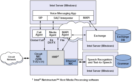 語(yǔ)音消息流通過(guò)MAPI文件過(guò)濾, 在HMP軟件和Exchange數(shù)據(jù)庫(kù)之間.